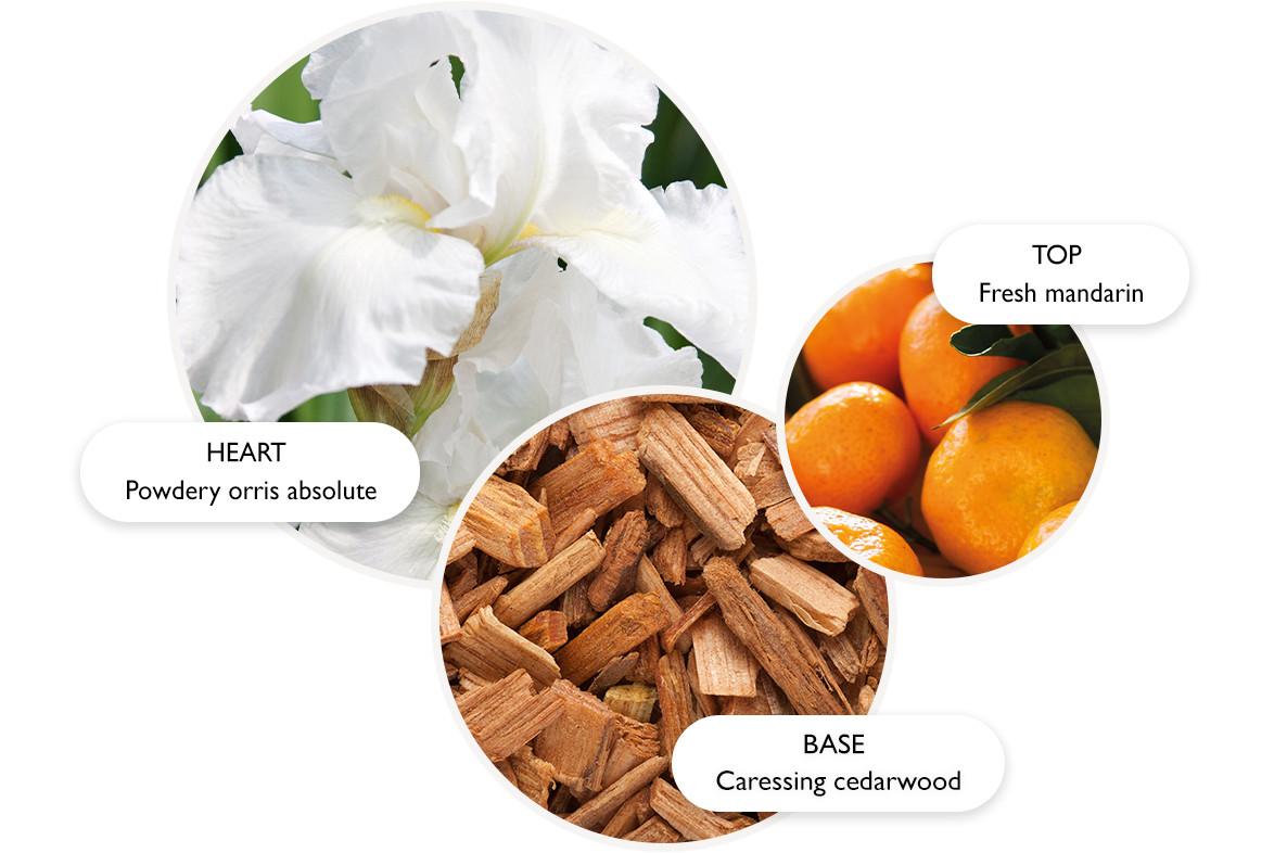 Egy kifinomult, elegáns illat, amely a púderes, virágos és enyhén fás tónusok harmonikus egyensúlyát kínálja. Az illat központi eleme az orris gyökér (az írisz gyökeréből származó jegy), amely kifinomult, púderes karaktert kölcsönöz.