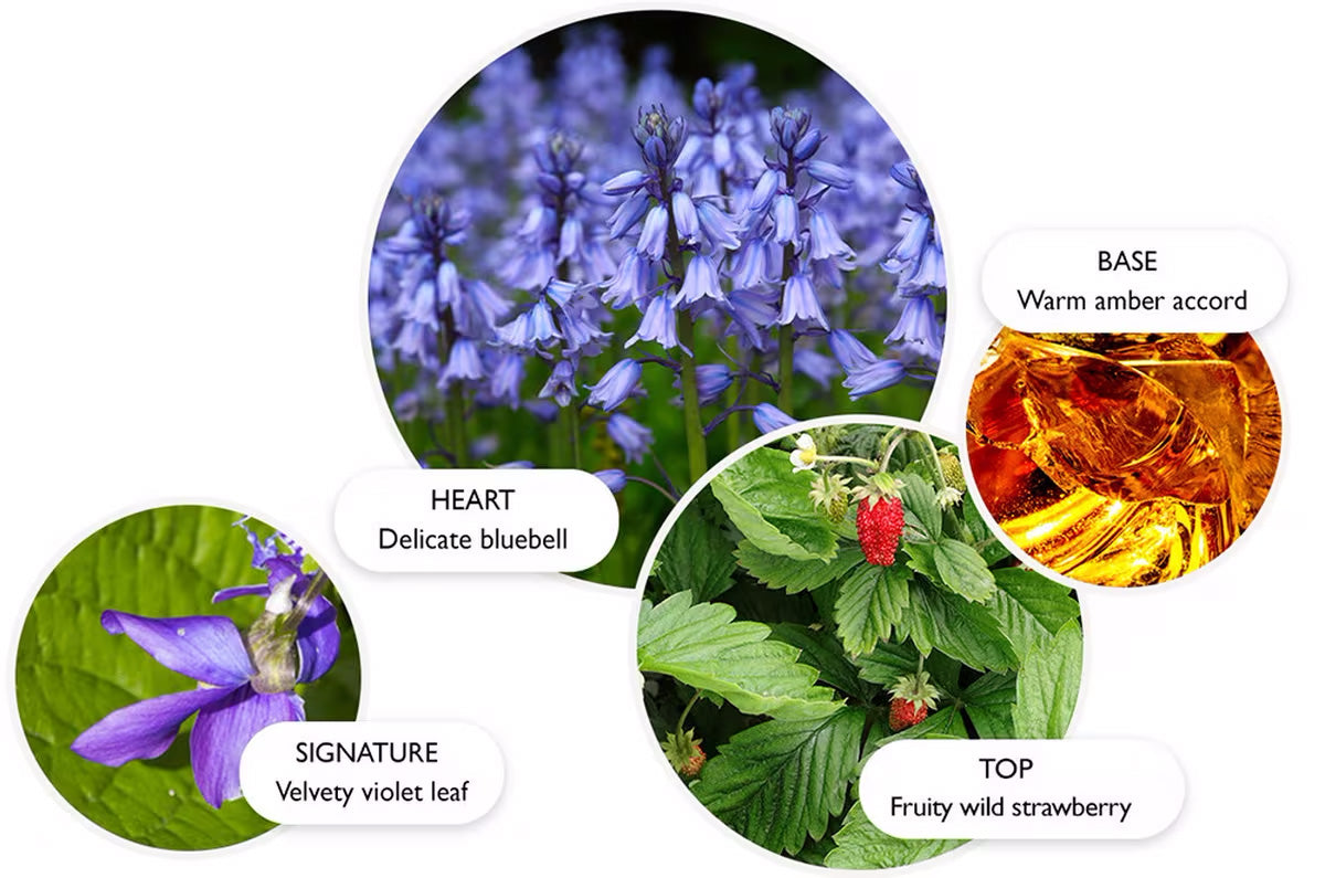 A Molton Brown Bluebell & Wild Strawberry testápoló hidratáló formulája könnyed, mégis tápláló. A friss kék harangvirág, lédús vad eper és meleg borostyán illata a nap folyamán finoman elkísér a bőrön.