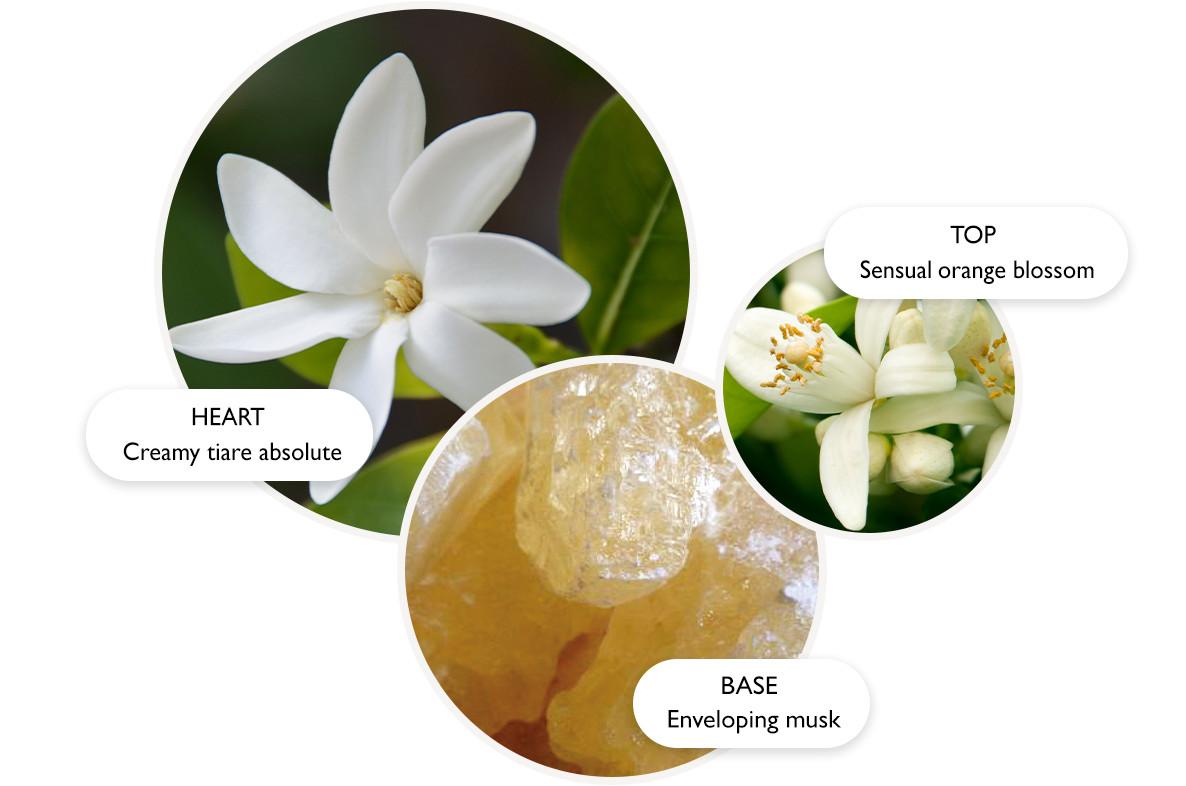 Hidratálja bőrét könnyű, finoman illatosított testápolónkkal, amelyet a fehér virágok, a pikáns narancsvirág, a csábító tiarévirág és a megnyugtató pézsma jegyei hatnak át.